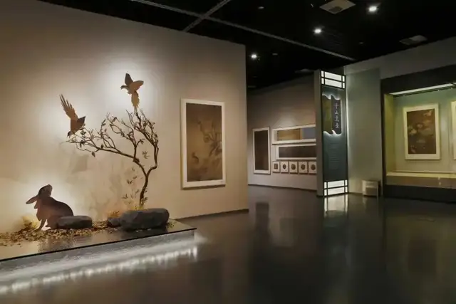 展览采用实物展示与数字化展览相结合的创新形式。在实物展示区,展品划分为“翎羽生香花鸟篇” “千山竞秀山水篇” “世相风华人物篇”三大主题板块。通过反复推敲展品的高低错落布局,选取《文会图》《双喜图》等经典画作进行场景复原,配合灯光与色彩的巧妙运用,营造出典雅优美的展示氛围,充分凸显传统绘画的艺术魅力。